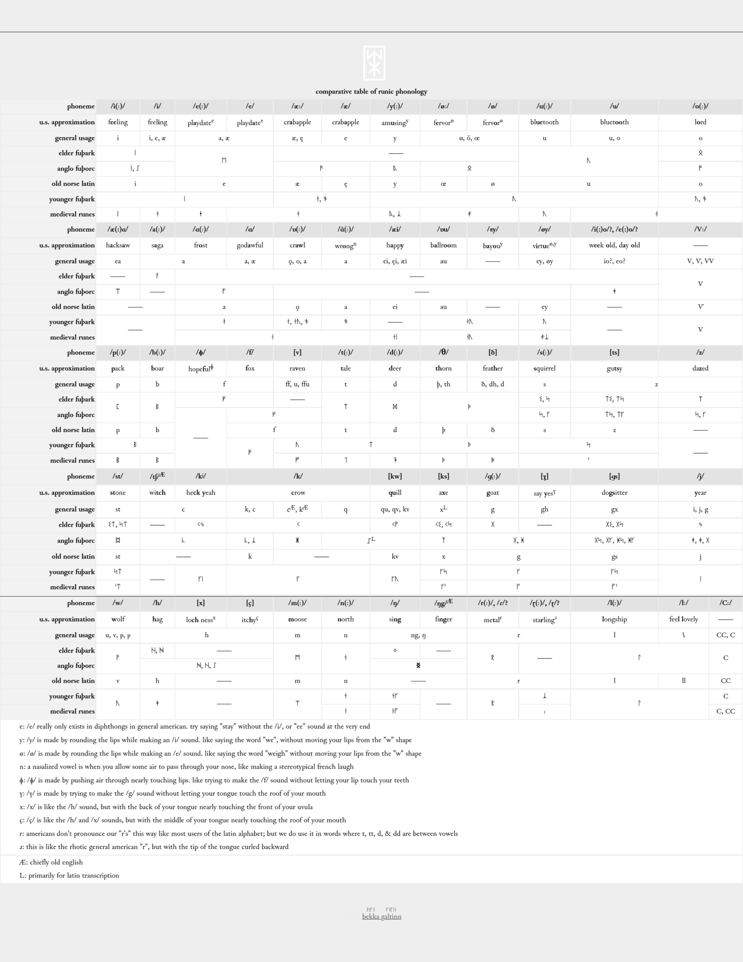 here's the 'comparative table of runic orthography' i've been working on. it's largely gutted and frankensteined from wikipedia, but reconfigured for readability and edited for errors. there are most certainly still errors, but i'll be visiting it regularly throughout my studies making adjustments as i learn more (last update einm. 2025)